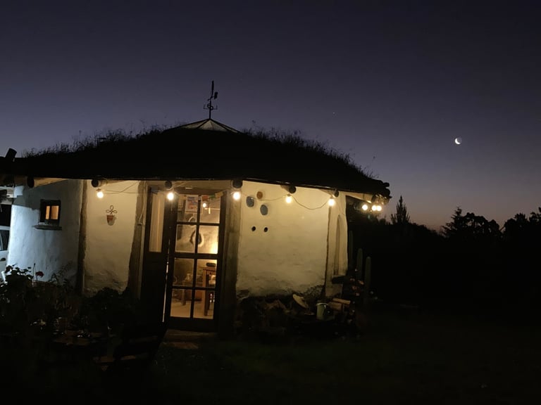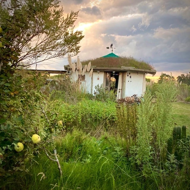 Tiene techo recíproco vivo, paredes de cob y es muy térmica; recoge agua de lluvia, tiene luz natural de una claraboya. El baño es seco, toda el agua se recicla y la energía es fotovoltaica.