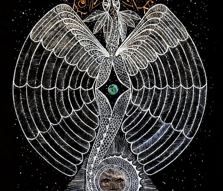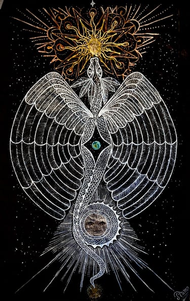 De la serie “La luz en la oscuridad”; la figura de luz de un ser encantado, una serpiente emplumada, que pasea por el cosmos hacia el misterio, conectando la tierra con el cielo.
