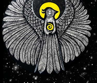 Parte de la serie “Transfiguraciones”: La mujer se convierte en ave, o el ave en mujer emplumada… Como mujer guardiano la vida no humana. Como ave presto mi vuelo para que humanos conozcan la libertad.